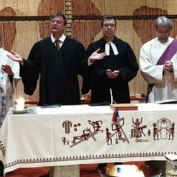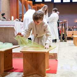 Diese Haltung spiegelte sich auch in der symbolhaften Fußwaschung wieder. Bei dieser wurden zwölf Fürbitten zu aktuellen Themen in der Gesellschaft gelesen. Dazu wurde für all jene, die nicht anwesend sein konnten, ein Tuch und eine Schale mit Wasser und einer Blume auf einen leeren Hocker gestellt.