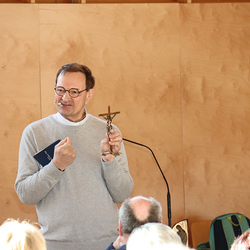 Zum Thema „Durchkreuzte Wege – Jesus geht mit“ hat Vikar Gerhard Hatzmann ein bewegendes, authentisches und glaubwürdiges Zeugnis von seinem eigenen Weg gegeben. Als Buchhändler liebte er seine Arbeit, aber seine Erfahrungen während einer schweren Erkrankung lassen ihn unmissverständlich erkennen, dass sein Leben eine Wendung nehmen muss. Seine Eltern machen eine Wallfahrt und beten um sein Leben, zur selben Zeit erwacht er aus dem Koma, aber im Koma sah er sich ganz deutlich und eindrucksvoll im Priesterkleid. Ein Zeichen, das ihn leitet und er lässt trotz aller Hürden das Ziel nicht aus den Augen. Kein leichter Weg mit vielen Hürden, doch unterwegs auf diesem Weg fällt eine Hürde nach der anderen, Gott räumte den Weg frei. Viel Ermutigung zum unbedingten Vertrauen auf die Führung Gottes im je eigenen Leben konnten wir Zuhörer aus dem Zeugnis von Gerhard schöpfen. Wollen wir Jesus folgen, wird immer wieder das Kreuz, nicht als Bedrohung, sondern als Zeichen des Heiles, das uns zum Licht führt, auf uns zu nehmen sein. Es wird nicht hinunterziehen, sondern aufwärts führen zur Auferstehung.