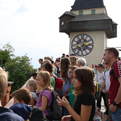 Am Nachmittag erwartete uns Birgit Pock am Grazer Hauptplatz für eine Führung auf den Grazer Schloßberg. Durch die Sporgasse ging es zuerst zum Uhrturm, um die Aussicht zu genießen, dann weiter zum Glockenturm mit der Liesl, den Kasematten und abschließend noch zum Uhrwerk des Uhrturms. Bergab waren wir dann aber um ein Vielfaches schneller als bergauf – zumindest jeder einzelne in unter 40 Sekunden. Denn diesen Weg erledigten wir mit der Schloßbergrutsche, die vielen ein Lächeln ins Gesicht zauberte.